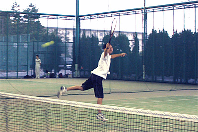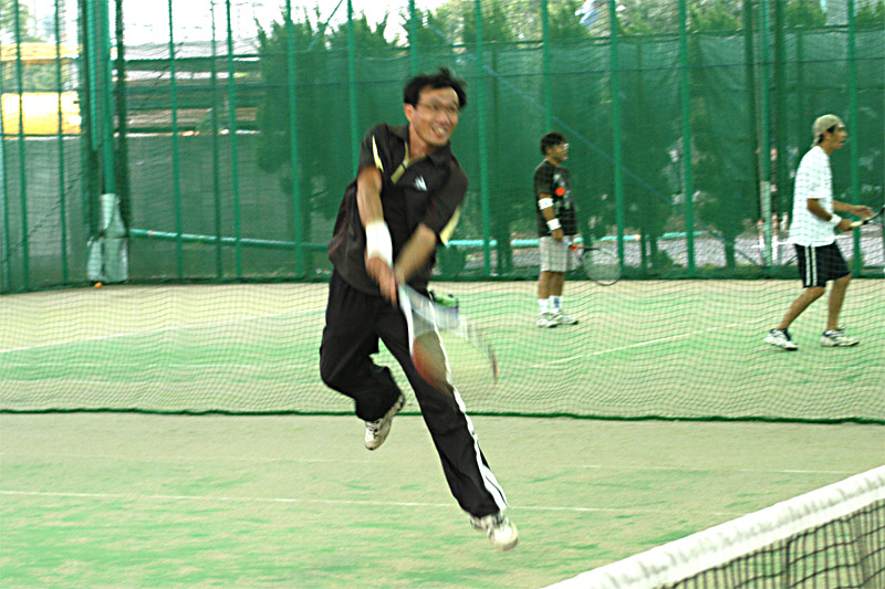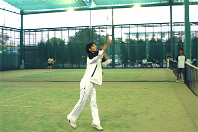 夕方から雨になりましたが、屋根つき人工芝コートが威力を発揮。 親睦テニス会は、滞りなく行われました。 | |
